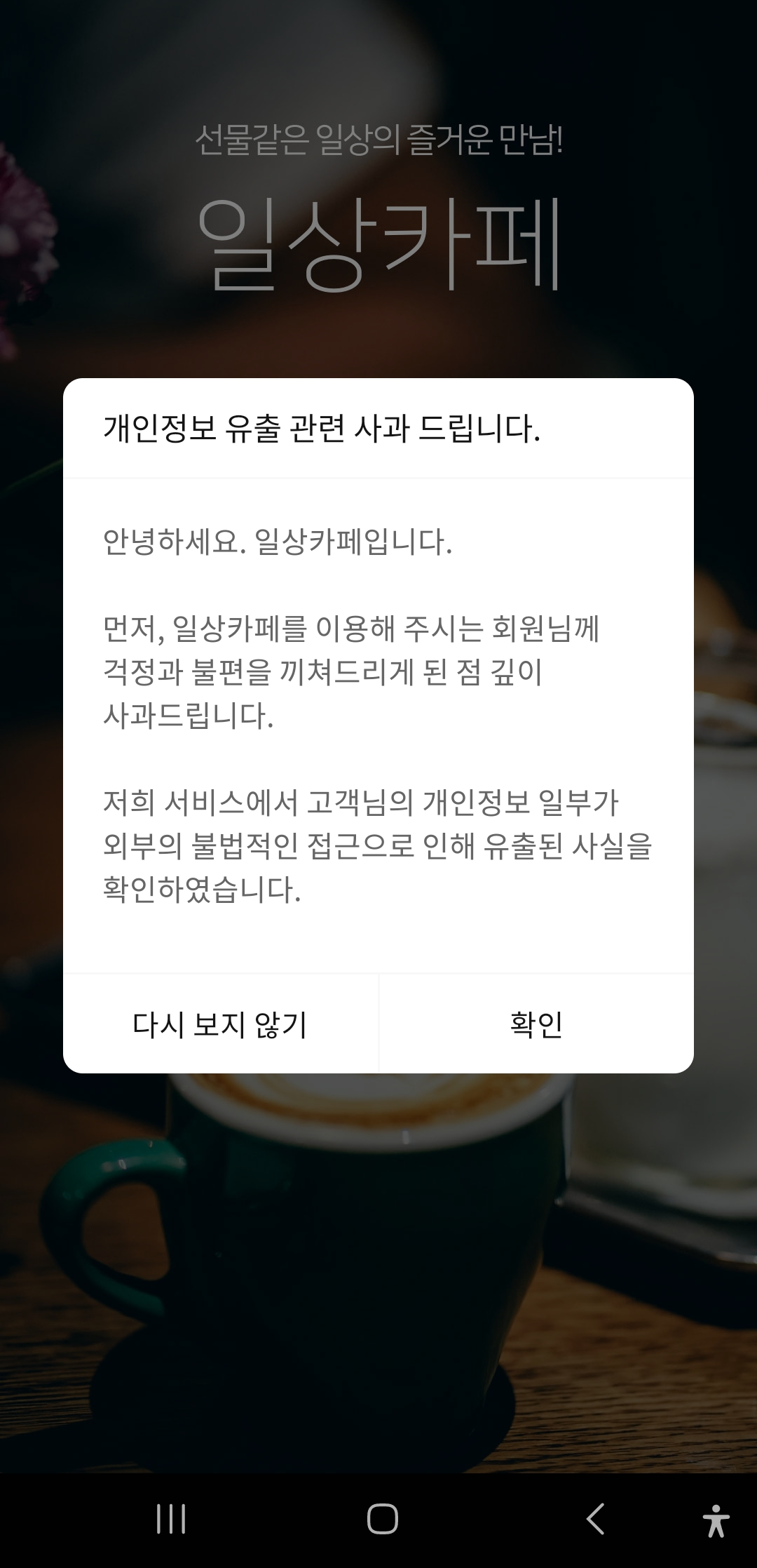 2025년 6월 2일(월) 오후 6시부터 자정까지, 모바일 기프티콘 선물 앱 '일상카페'의 일부 고객 개인정보가 외부의 불법적인 접근으로 인해 유출된 사실이 확인되었다. 해당 사고는 6월 4일 오전 11시 40분경에 인지되었으며, 이후 즉시 관계 기관에 신고 및 조치가 이루어졌다.