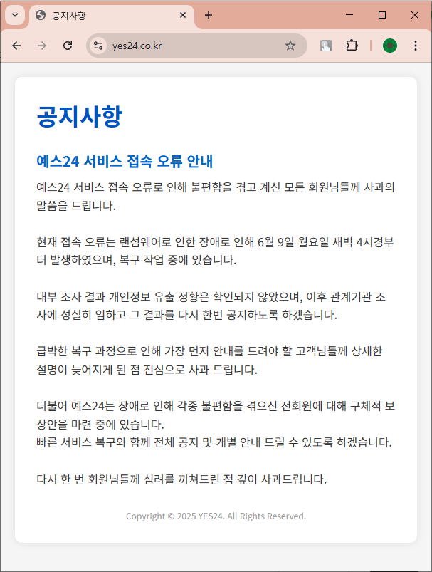 - 2025년 6월 10일 : 예스24 홈페이지에 랜섬웨어 피해 사실 공식 공지