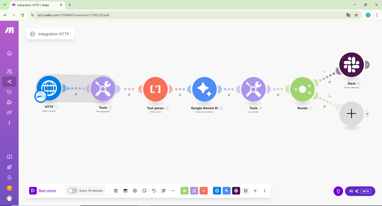 매일 아침 08시 “해킹”, “개인정보 유출” 등 보안 뉴스를 자동 수집하고, Gemini AI를 통해 요약한 후 텔레그램 채널에 공유하는 자동화 시나리오를 구축합니다.