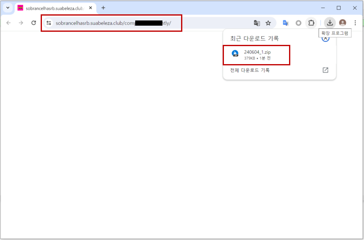 2. 메일 본문에 악성링크 클릭 시 암호압축(확장자 : zip)된 파일 자동 다운로드