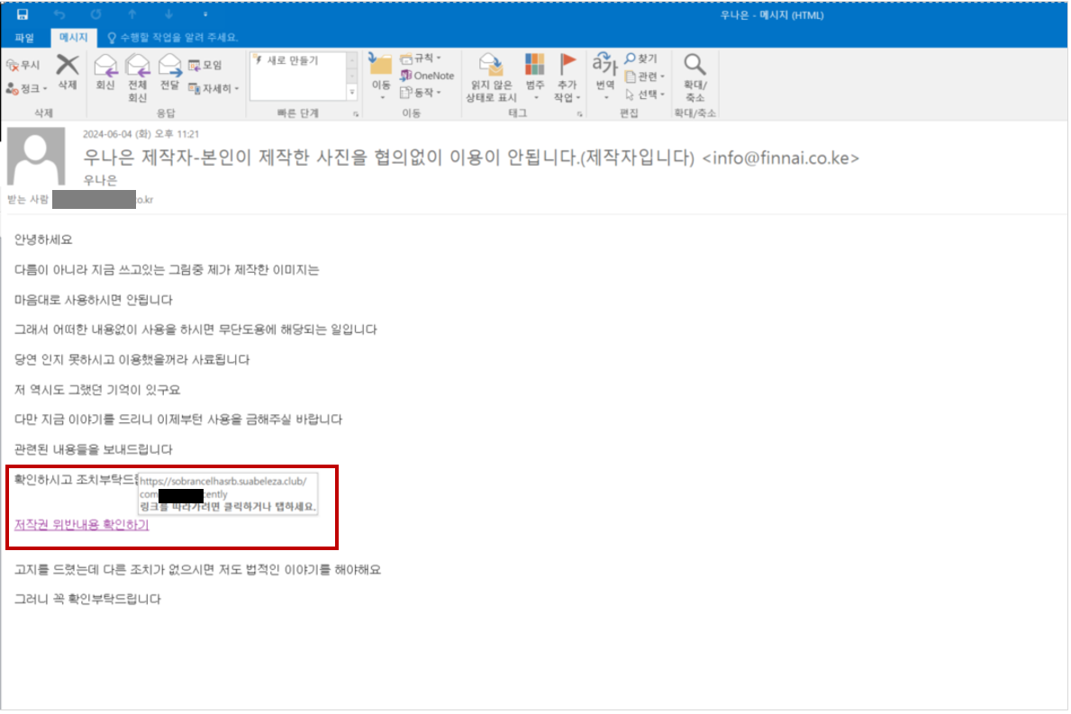 사진 무단 도용에 따른 사용 금지를 요청하는 피싱 메일이며, 메일 본문의 '저작권 위반내용 확인하기' 링크 클릭 시 암호 압축된 악성파일이 자동으로 다운로드되며, 압축 해제 및 실행 시 악성파일(랜섬웨어)에 감염 됨.