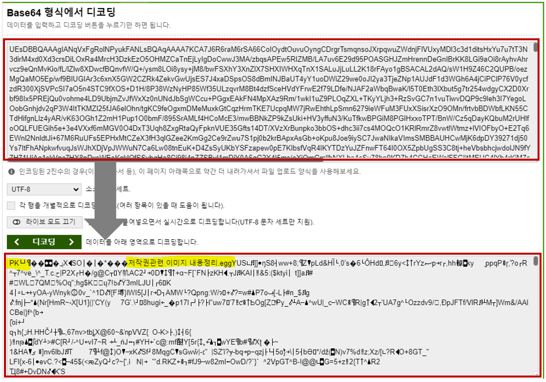 6. Base64로 인코딩 된 문자열을 디코딩 시 ZIP 파일 바이너리 내 EGG 확장자로 압축된 악성파일이 포함 됨.