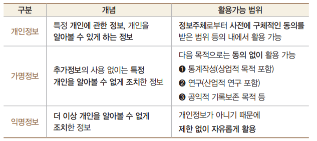 「신용정보법」은 가명처리와 익명처리 개념을 도입하였다. 개인정보에서 가명정보, 익명정보로 갈수록 식별가능성이 낮아지게 된다. 개인정보, 가명정보 및 익명정보를 개념 및 활용 가능한 범위를 기준으로 구분하면 다음과 같다