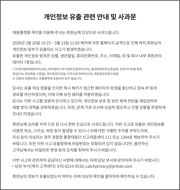 2026년 3월 20일부터 3월 23일까지 진학사가 운영하는 채용 플랫폼 ‘캐치’에서 해커에 의한 홈페이지 공격이 발생하였다. 해당 공격으로 회원 개인정보 일부가 유출된 정황이 확인되었으며, 회사는 이를 인지 후 즉시 차단 및 보안 조치를 수행하였다. 정확한 유출 규모는 공개되지 않았으나, 플랫폼 특성상 다수 구직자가 영향을 받을 가능성이 존재한다.