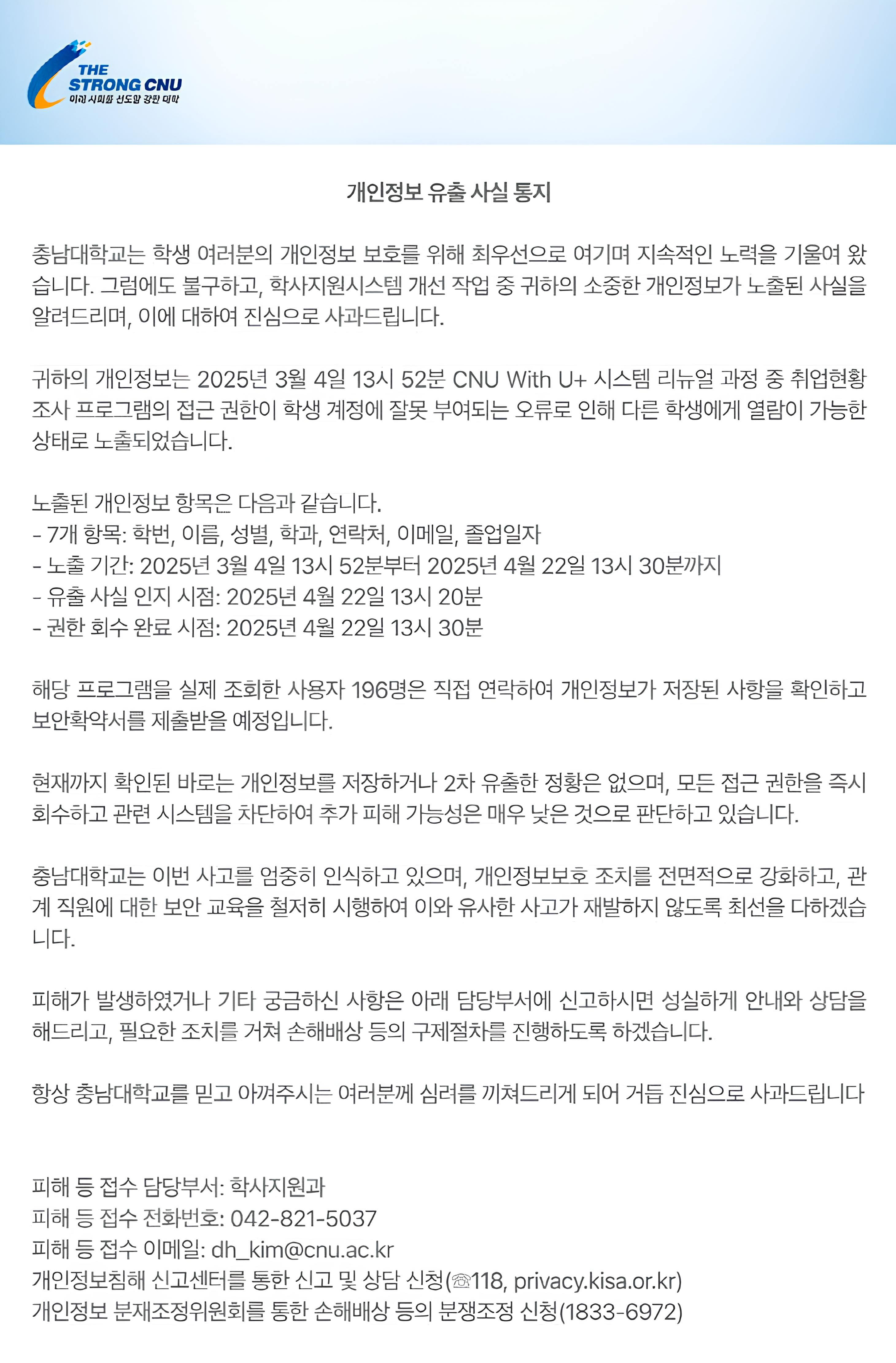 2025년 3월 4일(화), 충남대학교 학사 지원 시스템(CNU WITH U+) 리뉴얼 작업 중 접근 권한 설정 오류로 인해 졸업생 4,436명의 개인정보가 일반 학생 계정을 통해 열람 가능한 상태로 노출되는 사고가 발생하였다. 노출된 정보는 학번, 연락처, 이메일 등 기본 인적사항을 포함한 7개 항목으로, 해당 프로그램에 접근한 실제 사용자 수는 196명으로 확인되었다. 유출 사실은 한 달 반이 지난 4월 22일에서야 인지되었으며, 현재까지 2차 유출 정황은 없으나 재발 방지를 위한 조치가 시급하다.