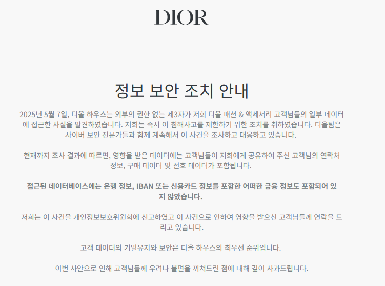 2025년 5월 7일(수), 프랑스 명품 브랜드 디올(Dior)이 외부 해킹 공격을 받아, 자사 패션 & 액세서리 고객의 일부 개인정보가 유출되는 사고가 발생했다. 유출된 정보는 고객의 연락처, 구매 이력, 선호 정보 등으로 구성되어 있으며, 금융정보는 포함되지 않은 것으로 확인되었다. 디올은 사고 직후 사이버 보안 전문가와 함께 조사에 착수하고, 개인정보보호위원회에 사건을 신고했다. 현재 피해 고객에게 개별 안내가 이루어지고 있다.