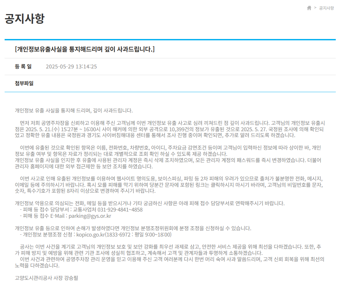 2025년 5월 27일(화), 고양도시관리공사가 운영하는 공영주차장 시스템에서 외부 해킹 공격으로 인해 고객 약 10,399명의 개인정보가 유출되는 사고가 발생했다. 해당 사고는 위탁 운영 중이던 시스템의 관리자 계정이 해커에 의해 탈취되면서 발생한 것으로, 국정원 및 사이버침해대응센터 조사를 통해 유출 사실이 확인되었다.
